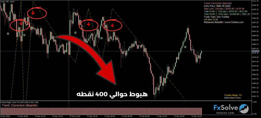 هبوط الذهب 400 نقطة بعد إشارات FxSolve Magic V4 – شرح كامل وتحديث لحركة السوق