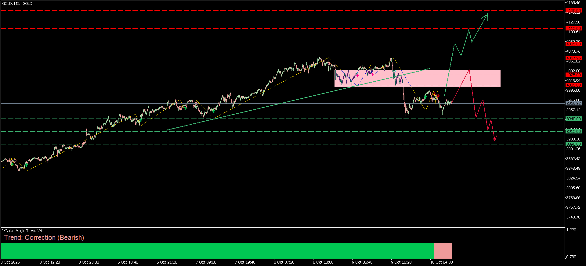 يُظهر مؤشر FxSolve Magic V4 أن الذهب بدأ في تصحيح هابط مؤقت بعد موجة صعود قوية استمرت خلال الأيام الماضية، وما زال السوق يتحرك تحت تأثير هذا التصحيح حتى الآن.
