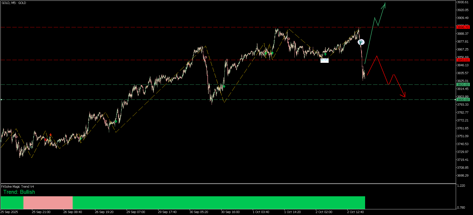 - اختراق 3896 لأعلى سيعيد الزخم الصاعد ويفتح المجال للعودة إلى القمم السابقة حول 3896 – 3900 ثم استهداف مستويات أعلى.