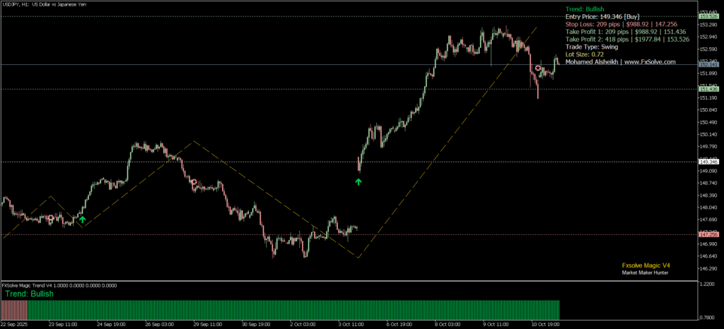 بعد موجة صعود قوية بدأت من مستويات 149.346 – وهي آخر منطقة شراء لصناع السوق اللي ظهرت عندها إشارة السهم الأخضر من مؤشرات FxSolve Magic V4 –
